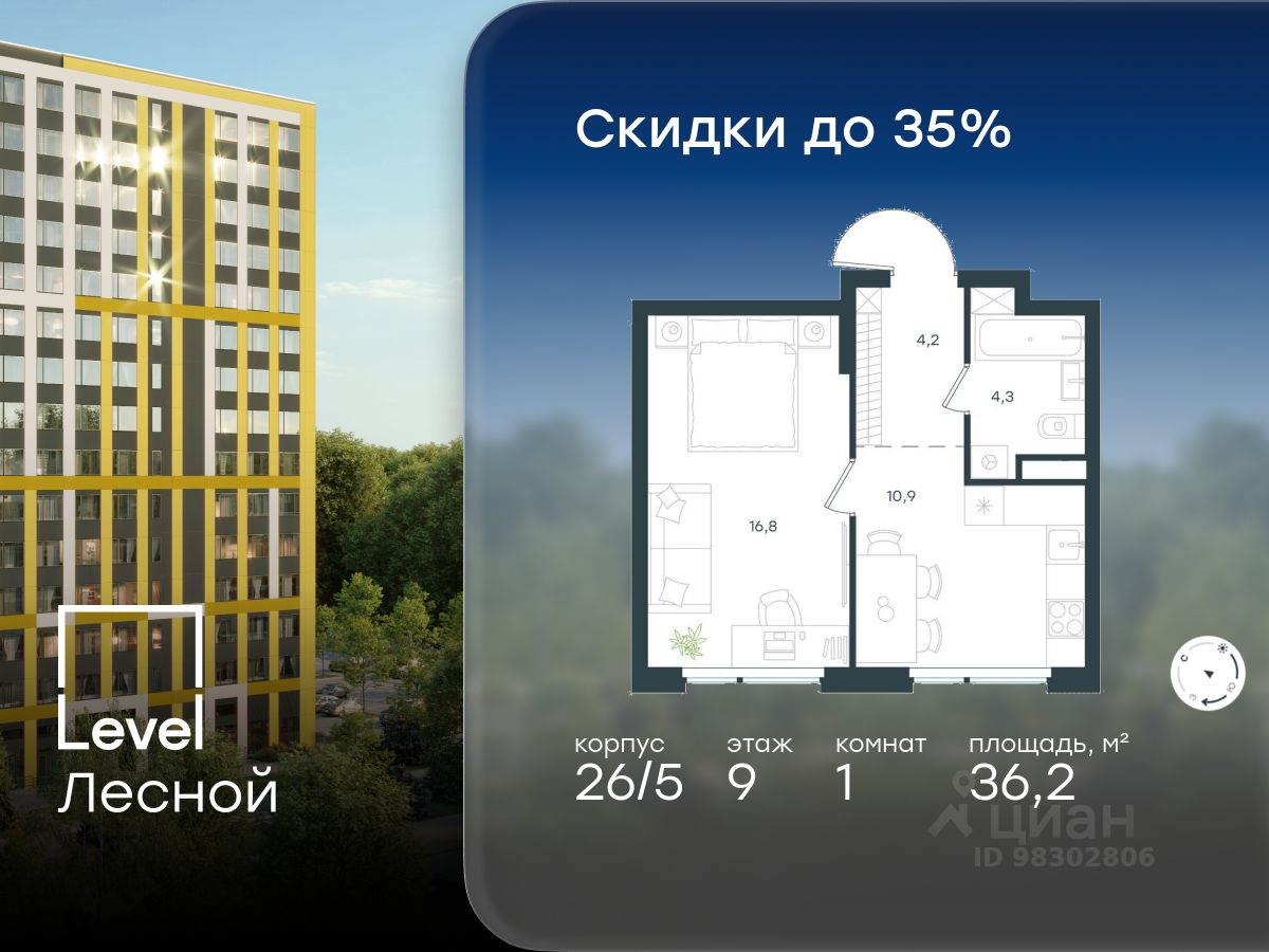 В районе, утопающем в густой зелени лесов, многочисленных парков и скверов, продаётся 1-комнатная квартира площадью 36.20 кв.м с отделкой white box. Квартира расположена на 9 этаже в жилом комплексе комфорт-класса Level Лесной (компания Level Group/Левел групп).