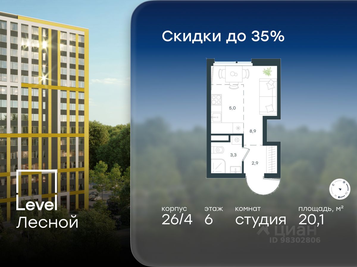 В районе, утопающем в густой зелени лесов, многочисленных парков и скверов, продаётся студия площадью 20.10 кв.м с отделкой white box. Квартира расположена на 6 этаже в жилом комплексе комфорт-класса Level Лесной (компания Level Group/Левел групп).
