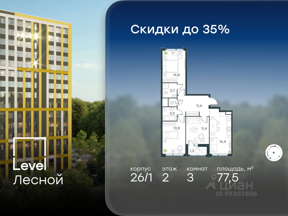 В районе, утопающем в густой зелени лесов, многочисленных парков и скверов, продаётся 3-комнатная квартира площадью 77.50 кв.м с отделкой white box. Квартира расположена на 2 этаже в жилом комплексе комфорт-класса Level Лесной (компания Level Group/Левел групп).