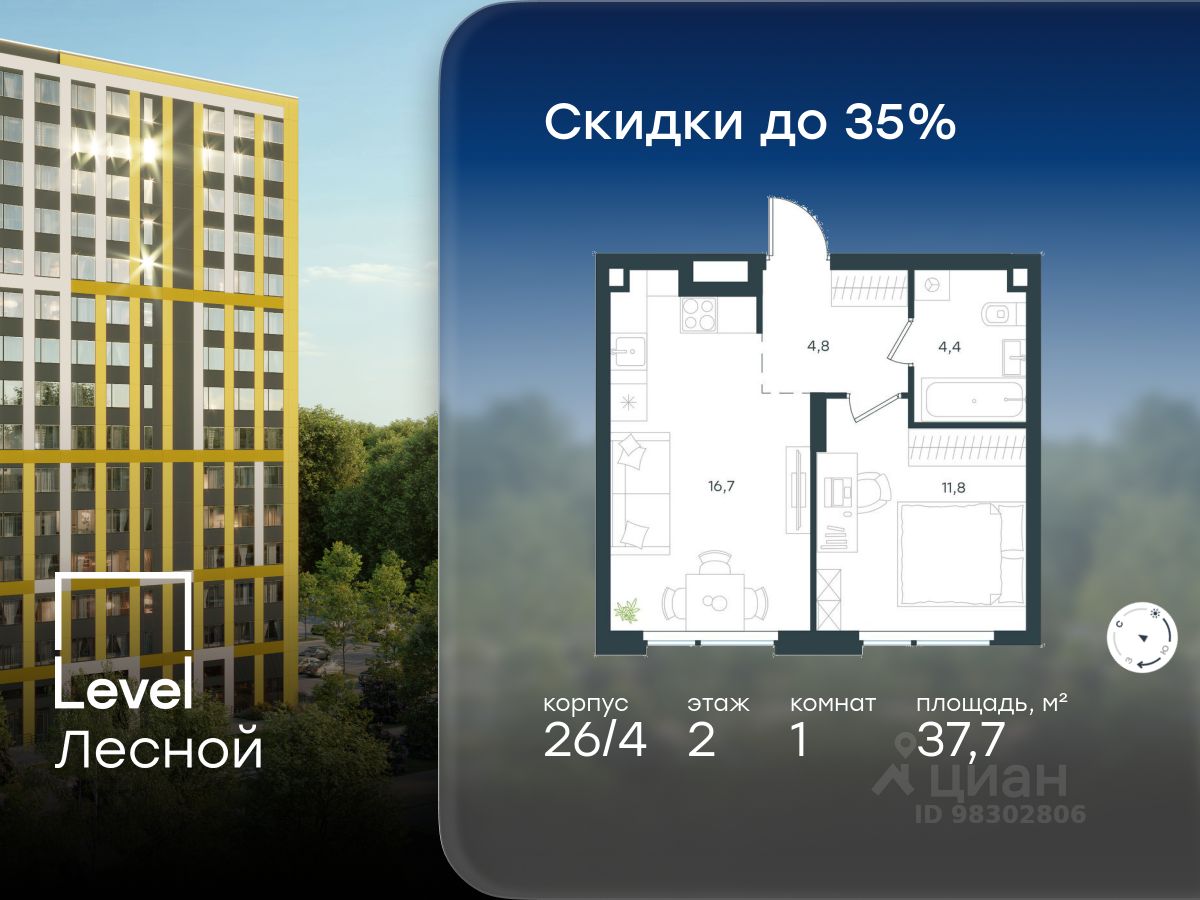 В районе, утопающем в густой зелени лесов, многочисленных парков и скверов, продаётся 1-комнатная квартира площадью 37.70 кв.м с отделкой white box. Квартира расположена на 2 этаже в жилом комплексе комфорт-класса Level Лесной (компания Level Group/Левел групп).