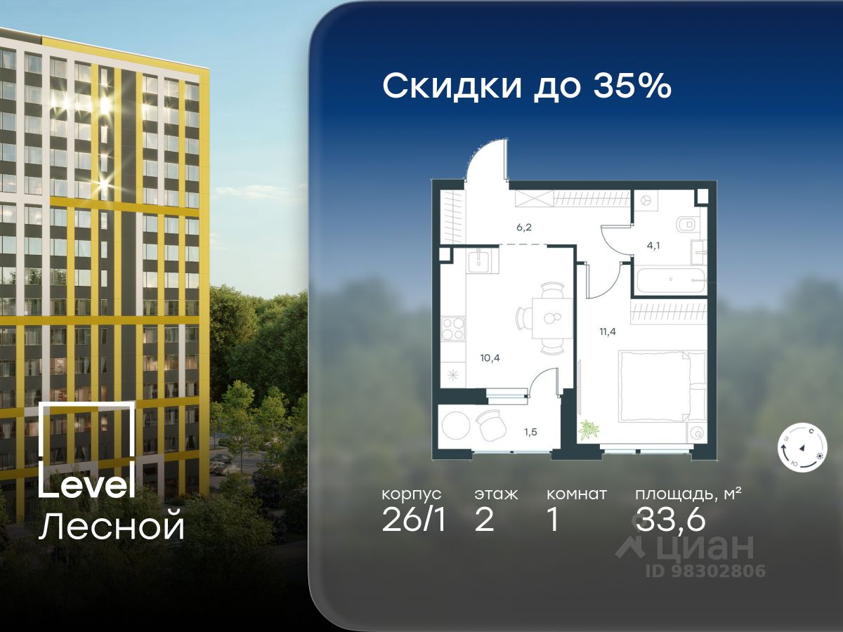 В районе, утопающем в густой зелени лесов, многочисленных парков и скверов, продаётся 1-комнатная квартира площадью 33.60 кв.м с отделкой white box. Квартира расположена на 2 этаже в жилом комплексе комфорт-класса Level Лесной (компания Level Group/Левел групп).