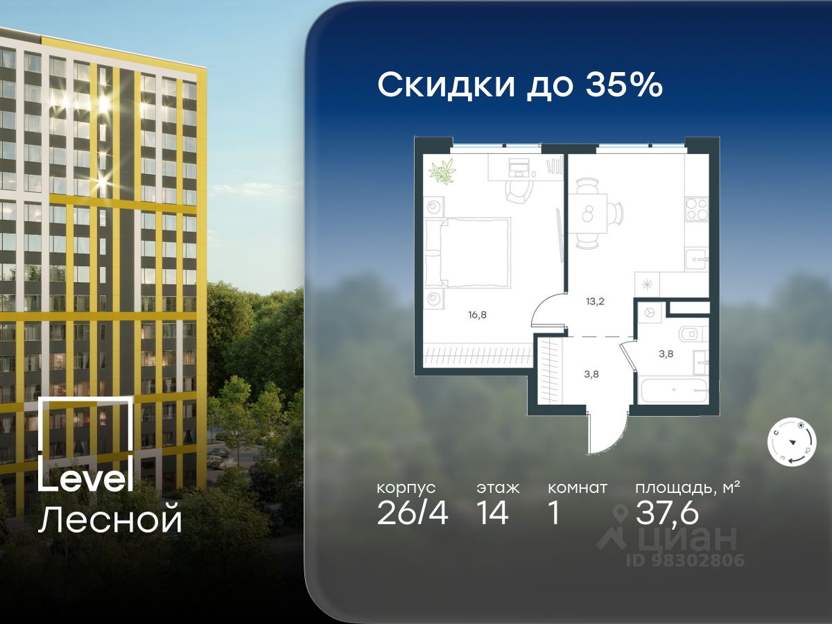 В районе, утопающем в густой зелени лесов, многочисленных парков и скверов, продаётся 1-комнатная квартира площадью 37.60 кв.м с отделкой white box. Квартира расположена на 14 этаже в жилом комплексе комфорт-класса Level Лесной (компания Level Group/Левел групп).