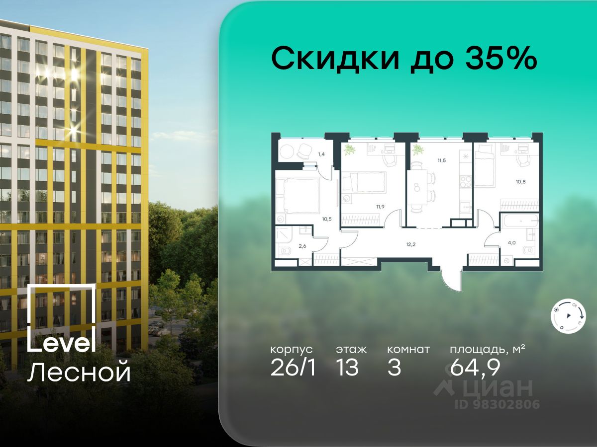 В районе, утопающем в густой зелени лесов, многочисленных парков и скверов, продаётся 3-комнатная квартира площадью 64.90 кв.м с отделкой white box. Квартира расположена на 13 этаже в жилом комплексе комфорт-класса Level Лесной (компания Level Group/Левел групп).