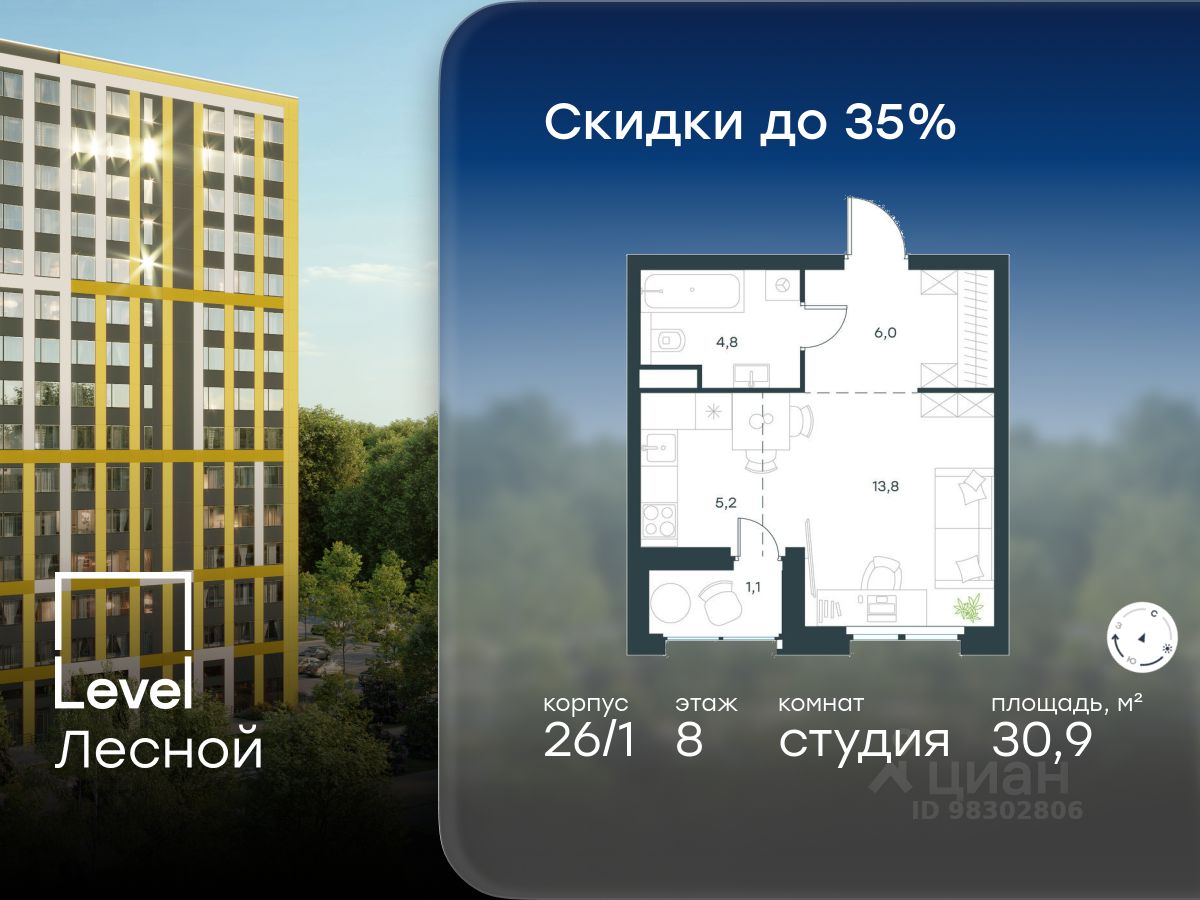 В районе, утопающем в густой зелени лесов, многочисленных парков и скверов, продаётся студия площадью 30.90 кв.м с отделкой white box. Квартира расположена на 8 этаже в жилом комплексе комфорт-класса Level Лесной (компания Level Group/Левел групп).