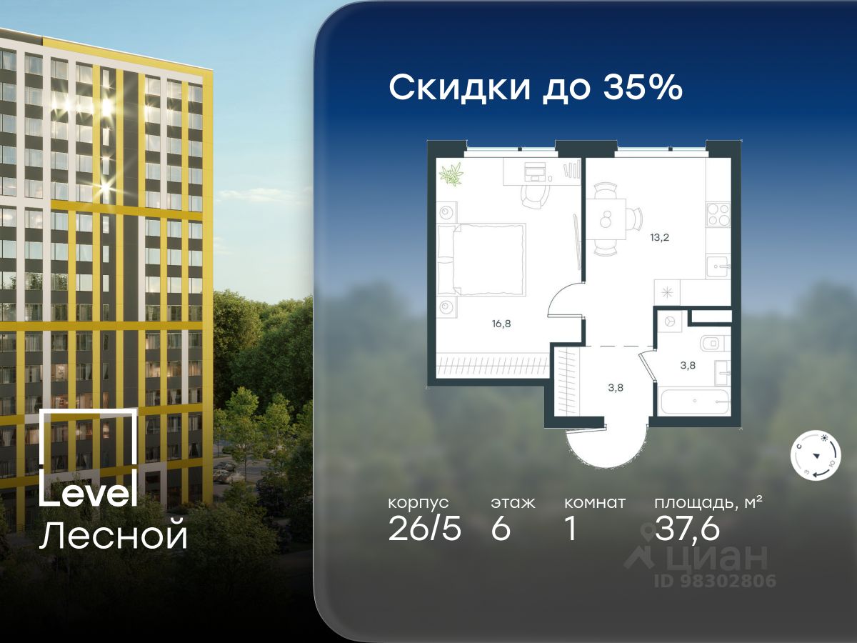 В районе, утопающем в густой зелени лесов, многочисленных парков и скверов, продаётся 1-комнатная квартира площадью 37.60 кв.м с отделкой white box. Квартира расположена на 6 этаже в жилом комплексе комфорт-класса Level Лесной (компания Level Group/Левел групп).