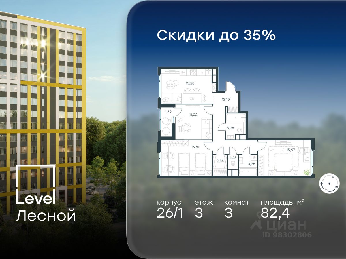 В районе, утопающем в густой зелени лесов, многочисленных парков и скверов, продаётся 3-комнатная квартира площадью 82.40 кв.м с отделкой white box. Квартира расположена на 3 этаже в жилом комплексе комфорт-класса Level Лесной (компания Level Group/Левел групп).