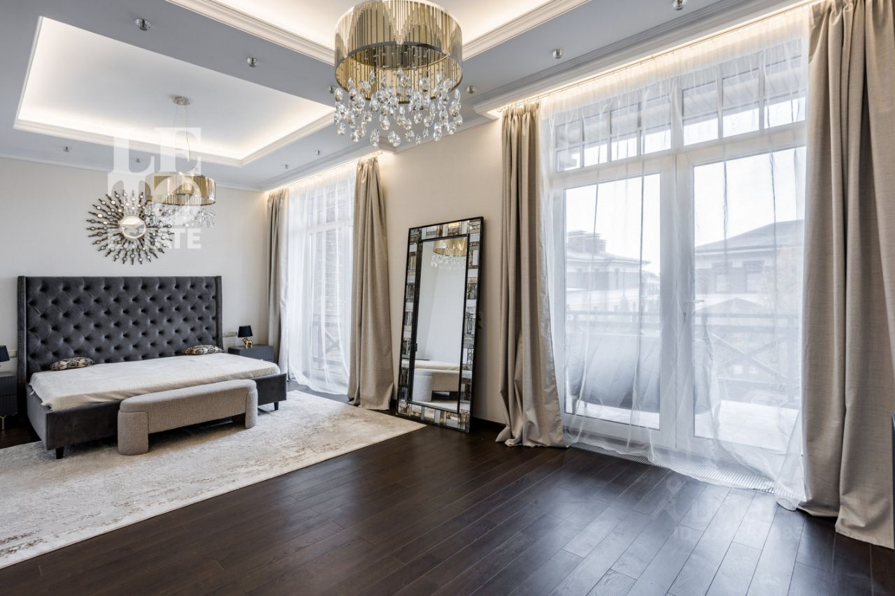 Планировка: Первый этаж: прихожая, гардеробная, котельная, постирочная, санузел, кухня - гостиная - столовая с выходом на участок. Второй этаж: мастер-спальня и санузел с душевой, ванной и гардеробной, спальня с санузлом и ванной, спальня и санузел с душевой и гардеробной. Третий этаж: спальня с кладовой и санузел с душевой, спальня с джакузи и сауной, душевая, санузел.