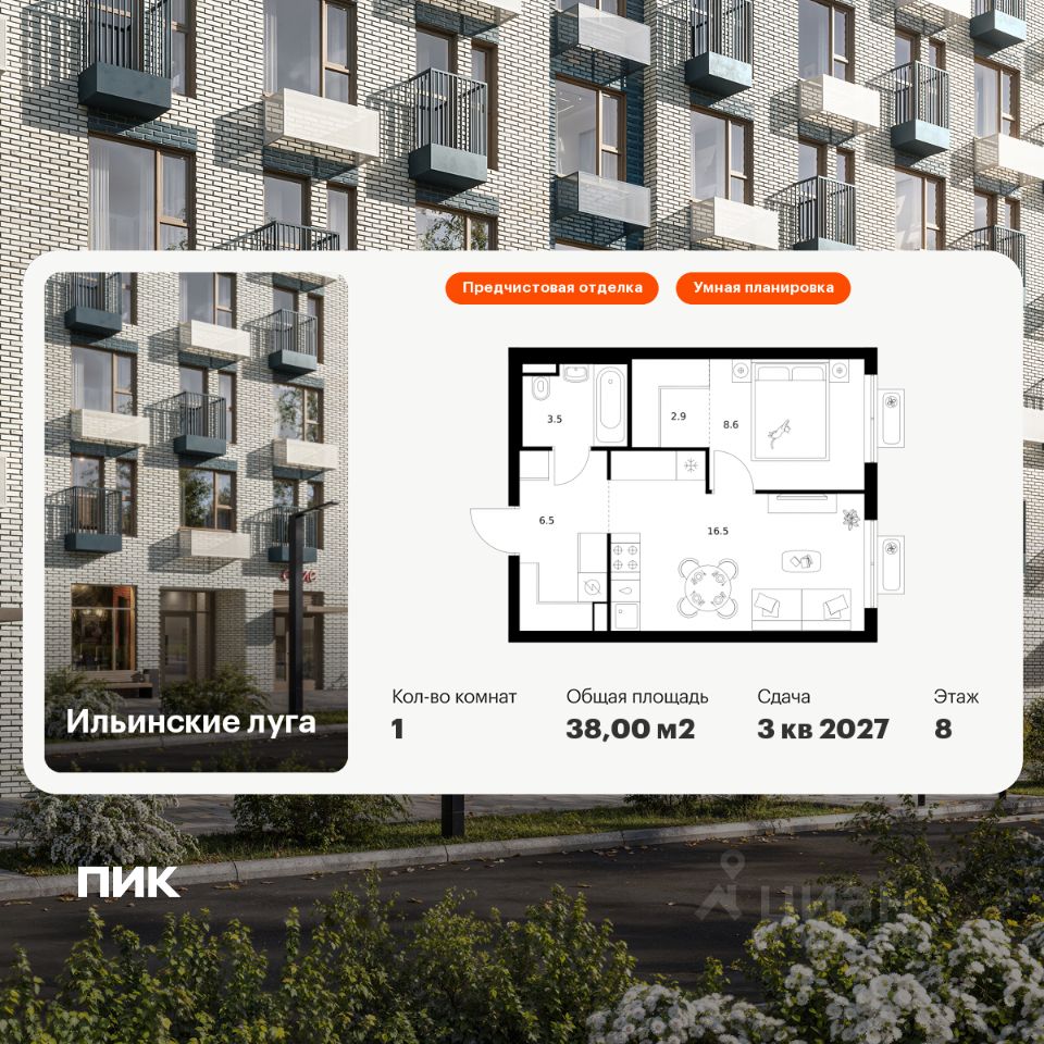 Продаётся 1-комн. квартира площадью 38 кв.м на 8 этаже 9 этажного дома (Корпус 4.3, Секция 1) проекта ПИК Ильинские луга. Светлый просторный подъезд на уровне земли, функциональная планировка, большие окна, предчистовая отделка.