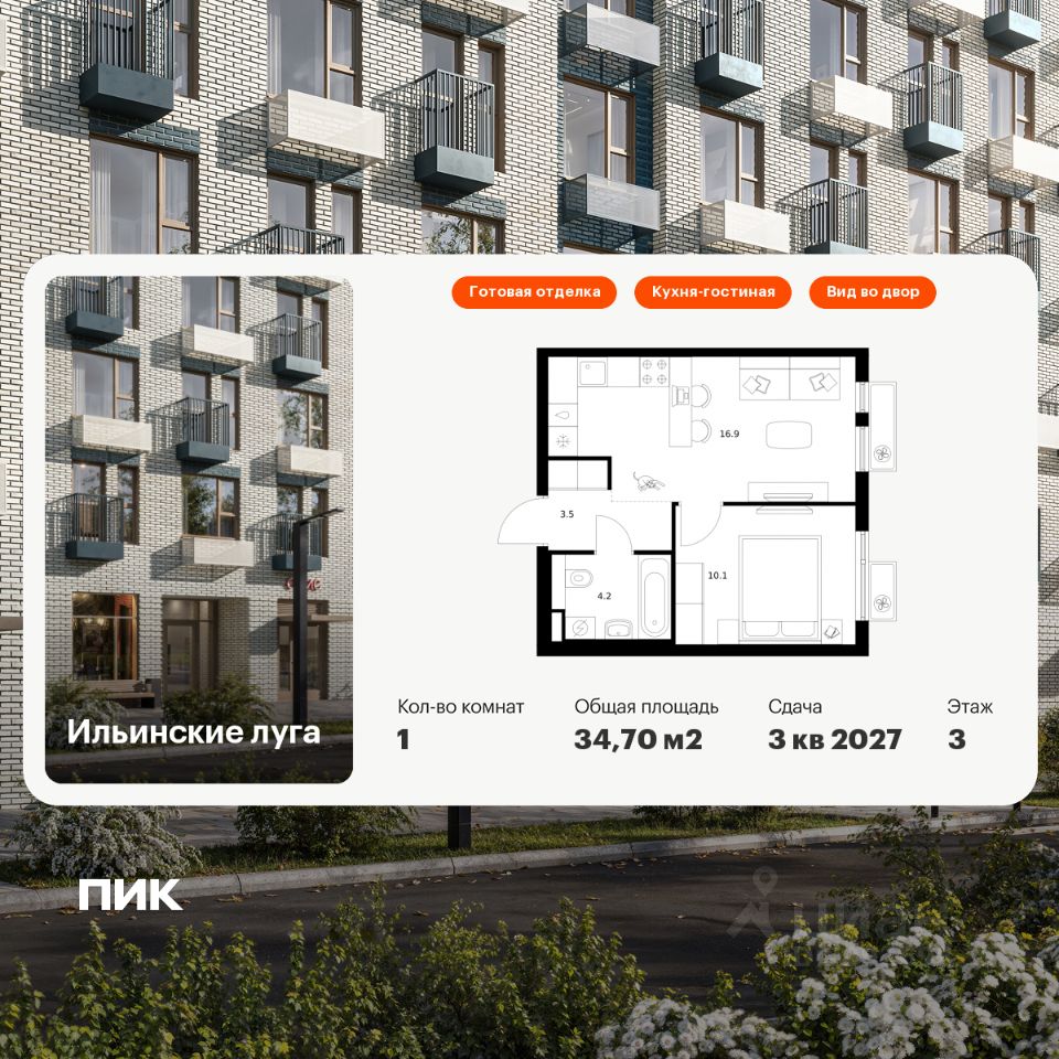 Продаётся 1-комн. квартира площадью 34,7 кв.м на 3 этаже 9 этажного дома (Корпус 3.6, Секция 5) проекта ПИК Ильинские луга. Светлый просторный подъезд на уровне земли, функциональная планировка, большие окна, c отделкой.