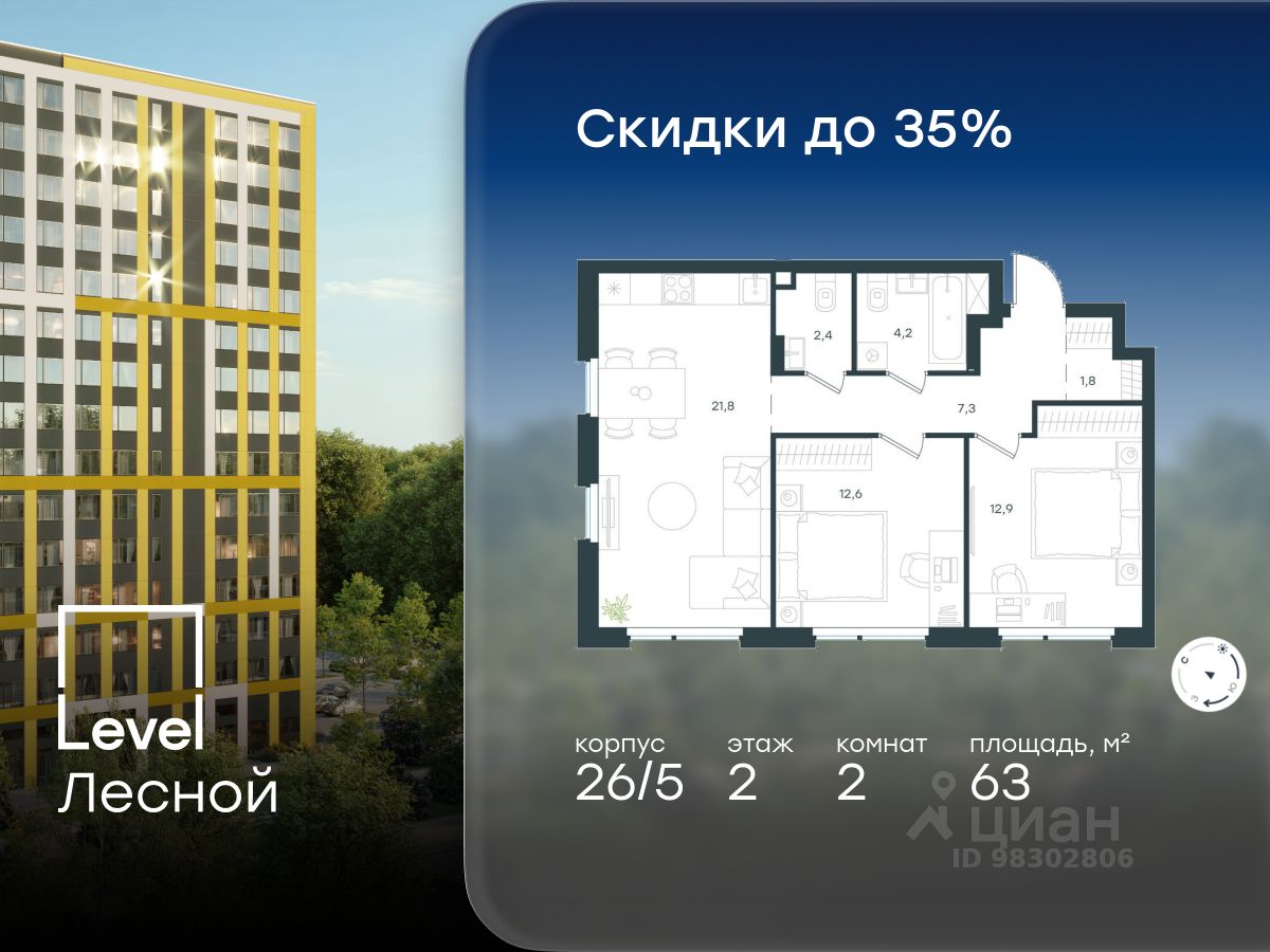 В районе, утопающем в густой зелени лесов, многочисленных парков и скверов, продаётся 2-комнатная квартира площадью 63.00 кв.м с отделкой white box. Квартира расположена на 2 этаже в жилом комплексе комфорт-класса Level Лесной (компания Level Group/Левел групп).