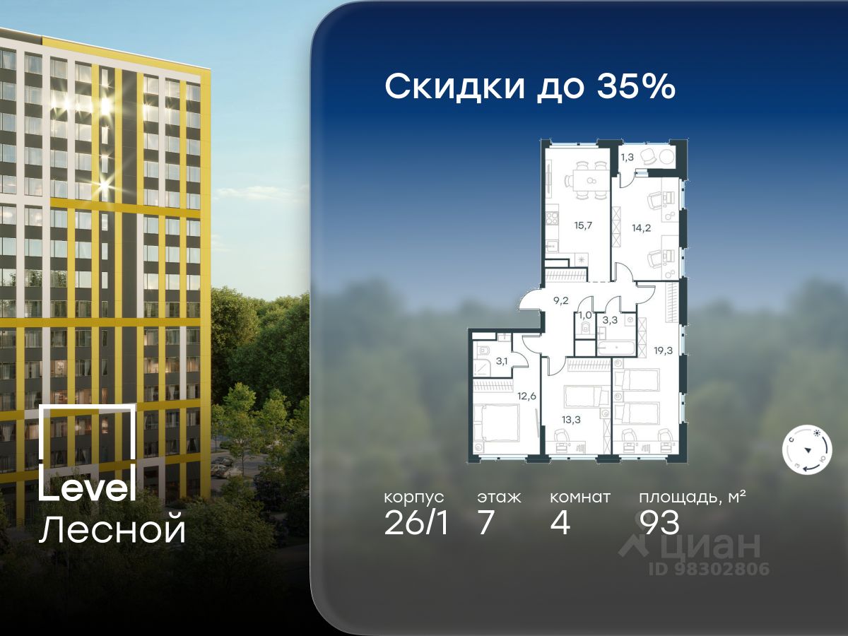 В районе, утопающем в густой зелени лесов, многочисленных парков и скверов, продаётся 4-комнатная квартира площадью 93.00 кв.м с отделкой white box. Квартира расположена на 7 этаже в жилом комплексе комфорт-класса Level Лесной (компания Level Group/Левел групп).