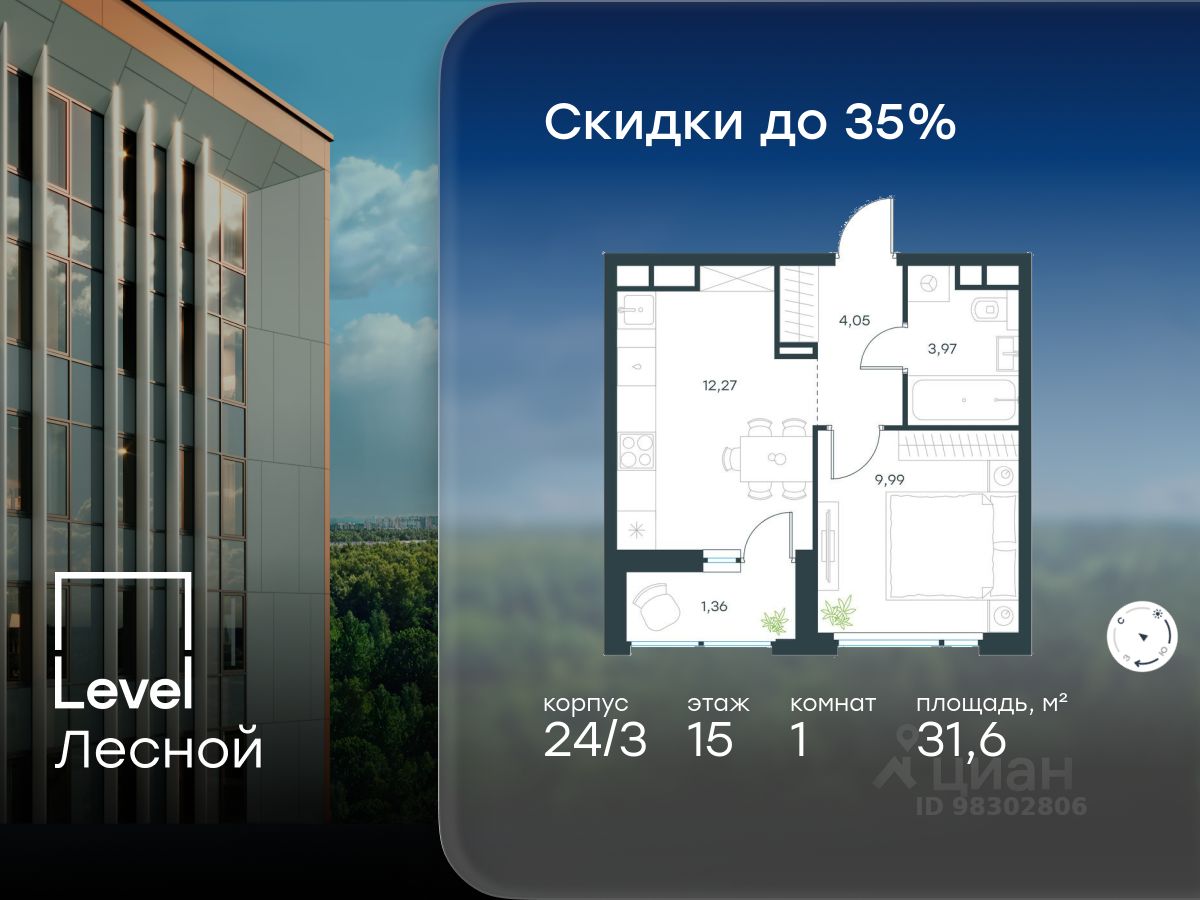 В районе, утопающем в густой зелени лесов, многочисленных парков и скверов, продаётся 1-комнатная квартира площадью 31.60 кв.м с отделкой white box. Квартира расположена на 15 этаже в жилом комплексе комфорт-класса Level Лесной (компания Level Group/Левел групп).