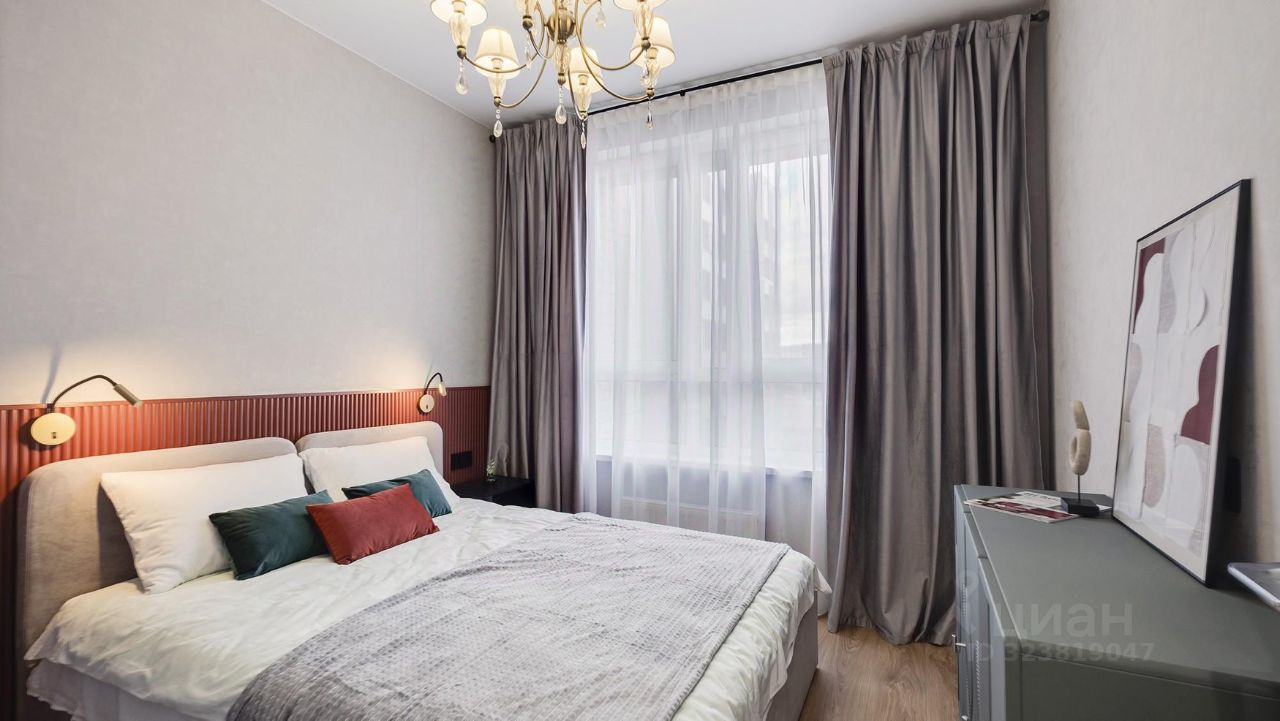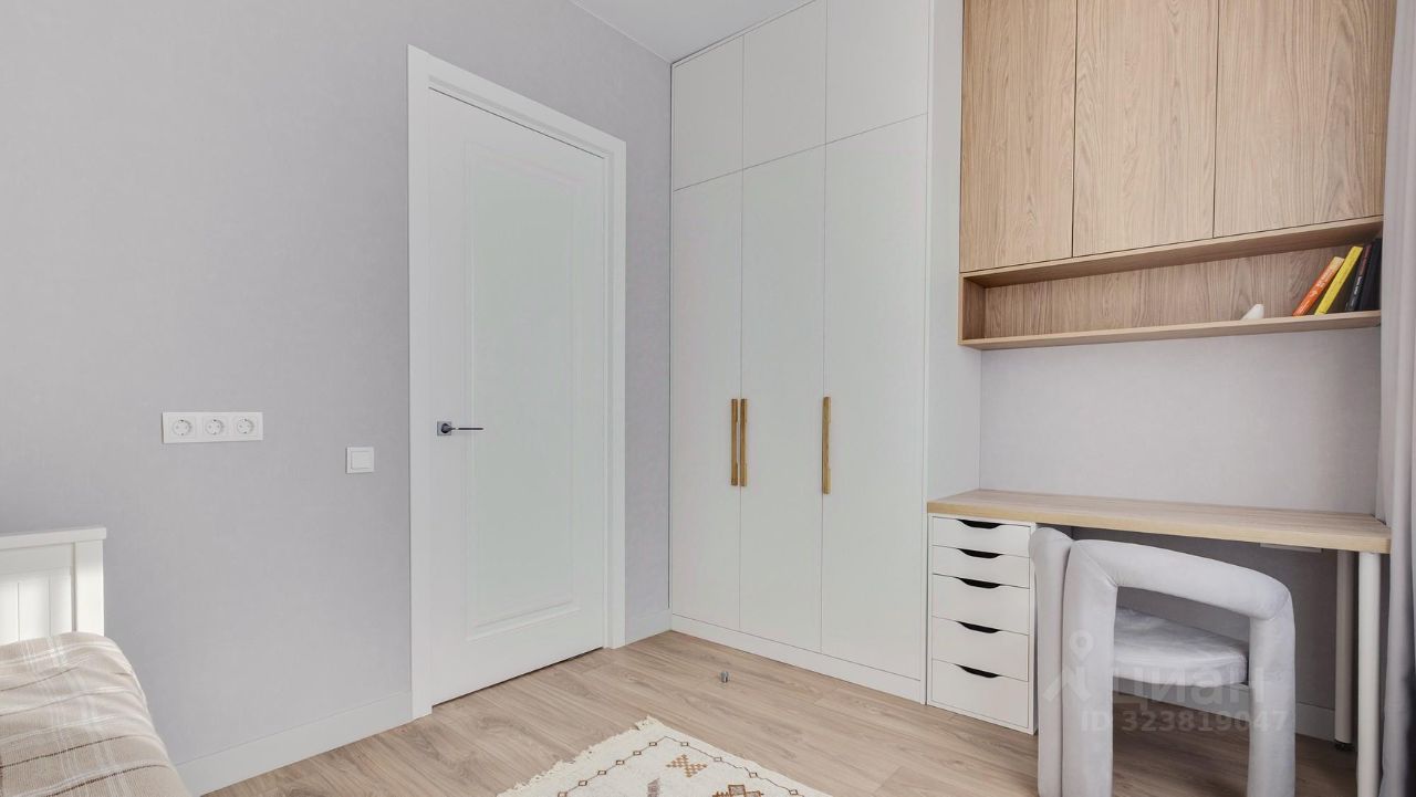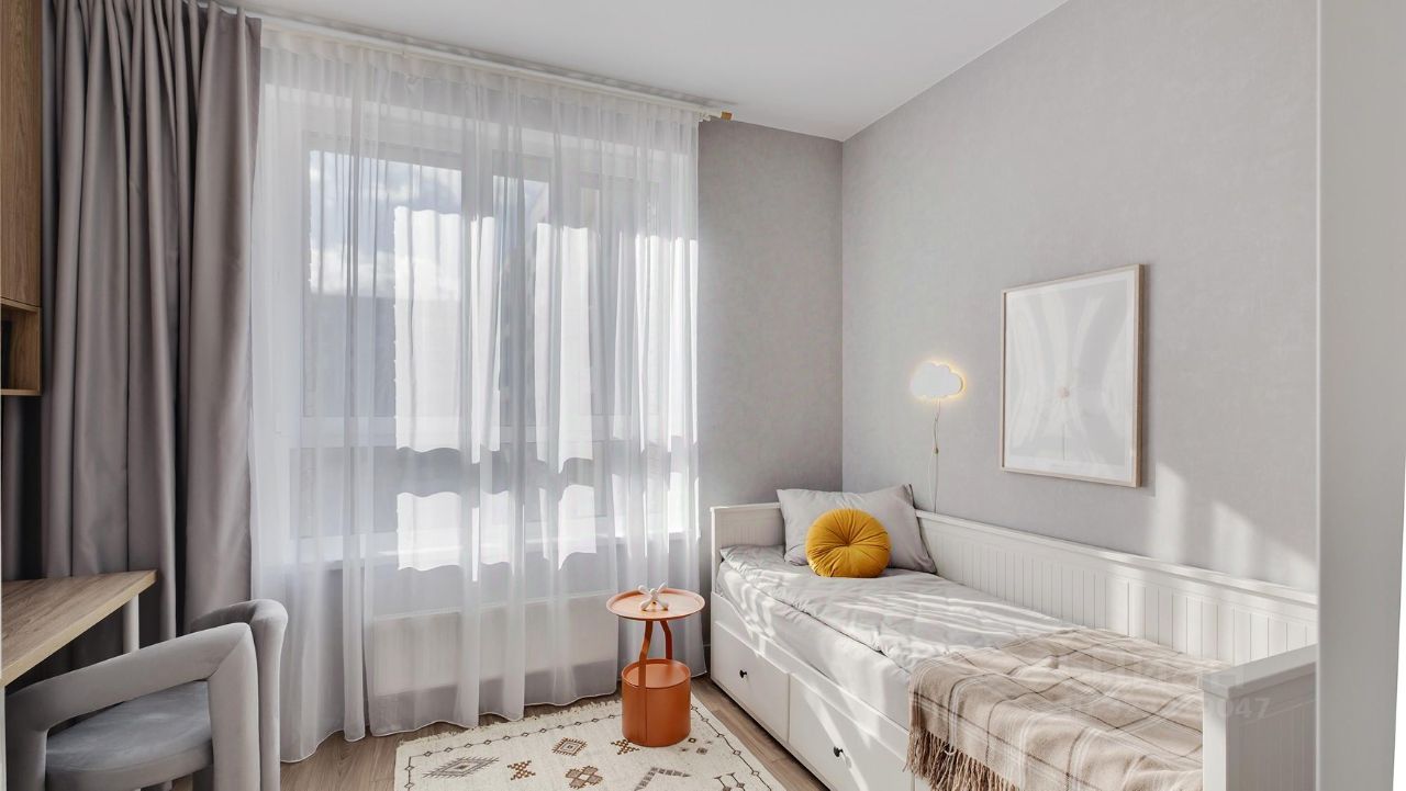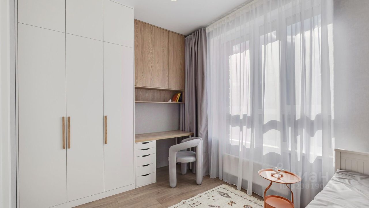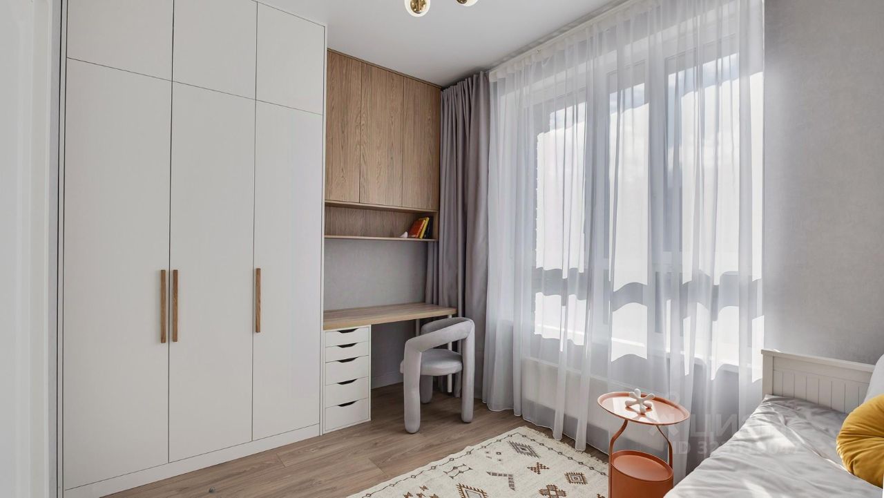 Кухня-гостиная с 3-мя окнами во внутренний двор Спальня с полноценной двуспальной кроватью, комодом и гардеробои Детская (или кабинет) со встроенной мебелью Два санузла: с душевой кабиной и с ванной