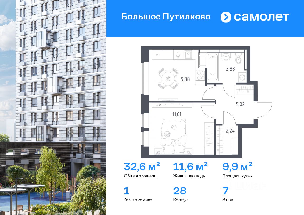 Строим кварталы для жизни с заботой о будущем. Предлагается 1-комнатная квартира комфорт-класса 32,63 кв.м в корпусе 28 на 7 этаже, в ЖК ''Большое Путилково'' Квартира без отделки. Доступность опции ''отделка'' и возможность комплектации мебелью и декором уточняйте у застройщика.
