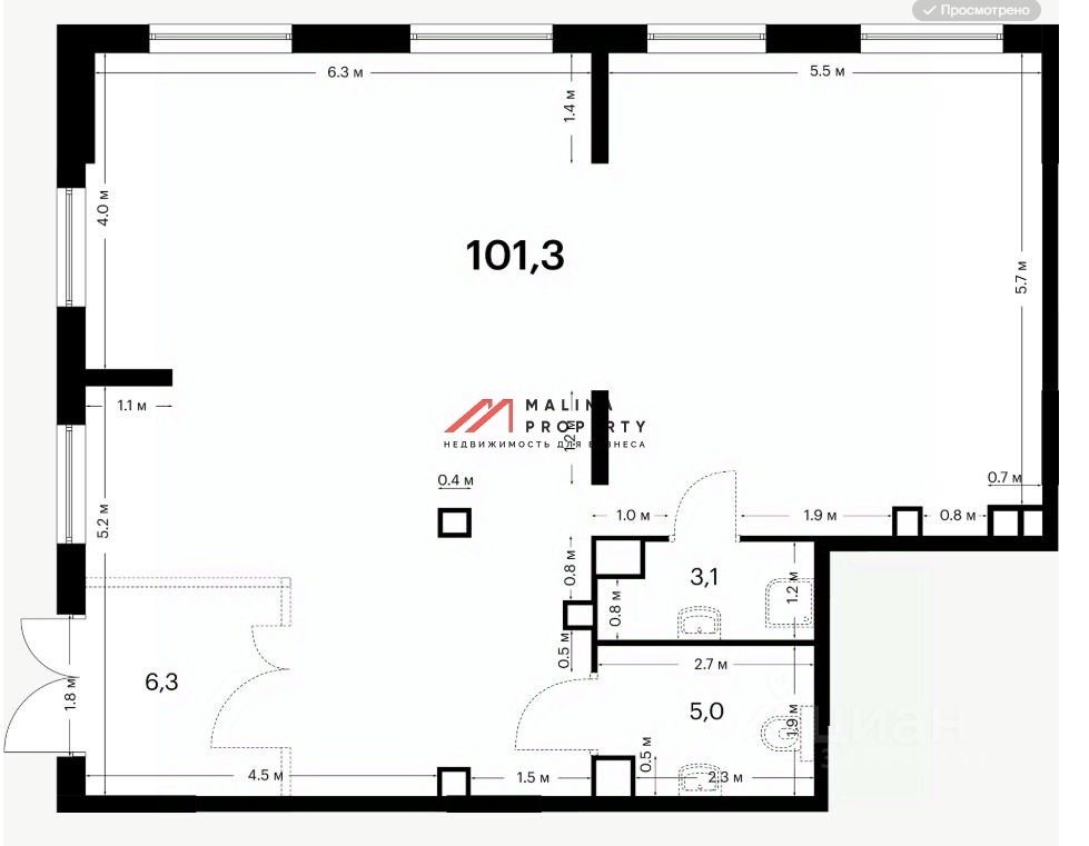 Помещение 101,3 м2, располагается на 1 этаже, открытая планировка, отдельный вход с фасада, высота потолка 4,69 м, витринные окна по фасаду. Электрическая мощность 20 кВт. Парковка перед фасадом. Место для размещения рекламы.