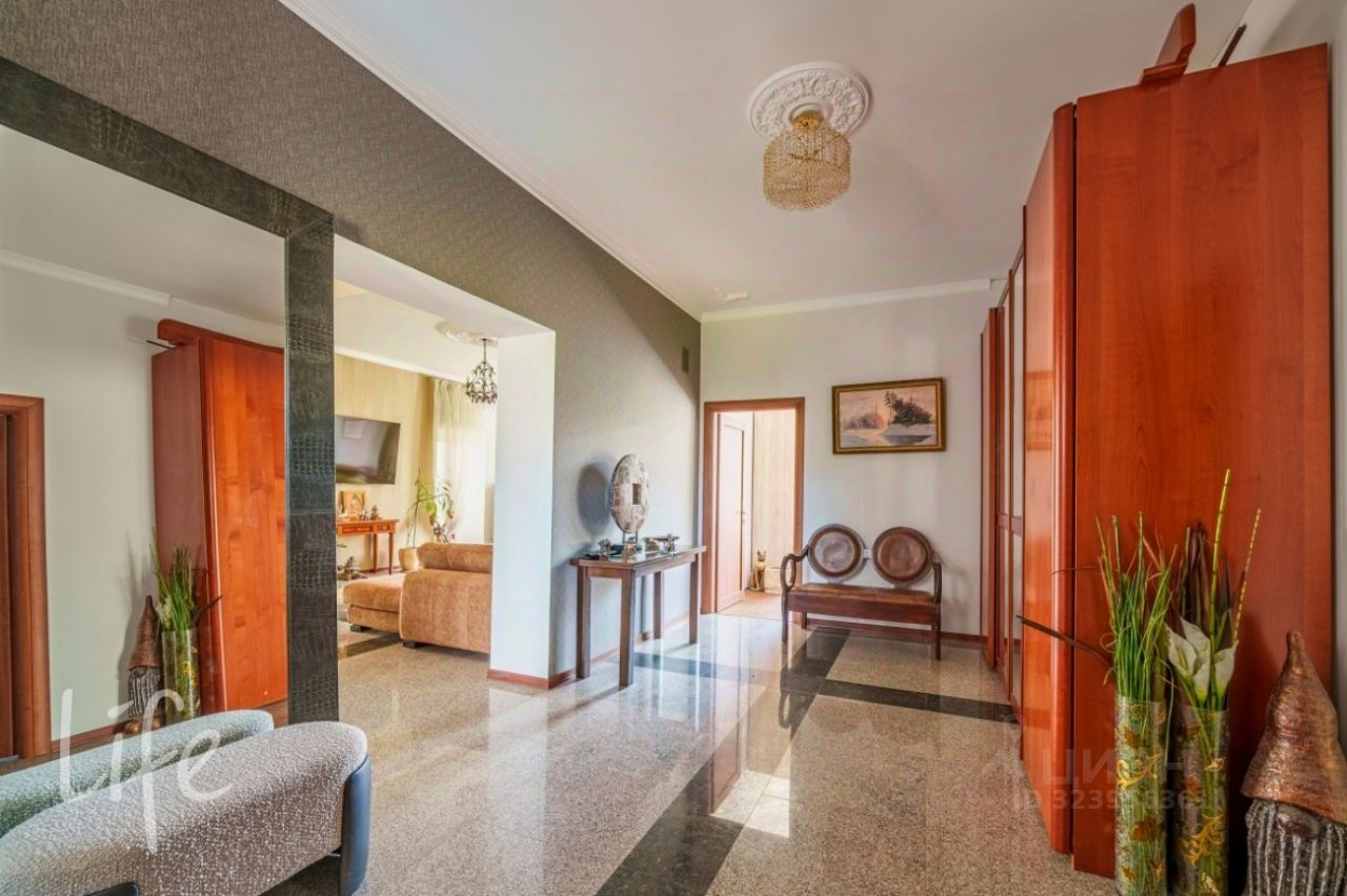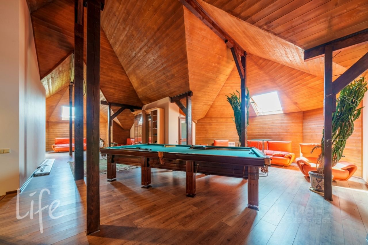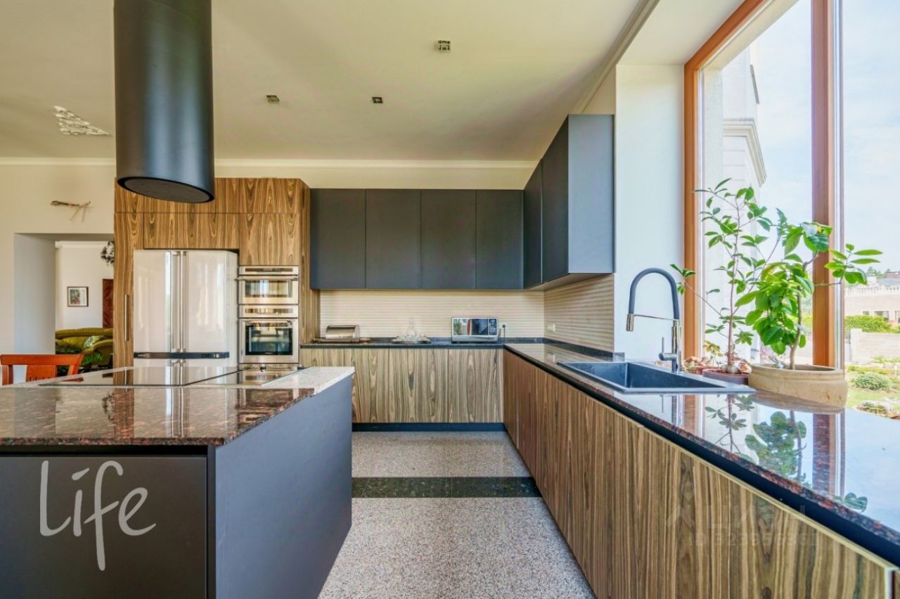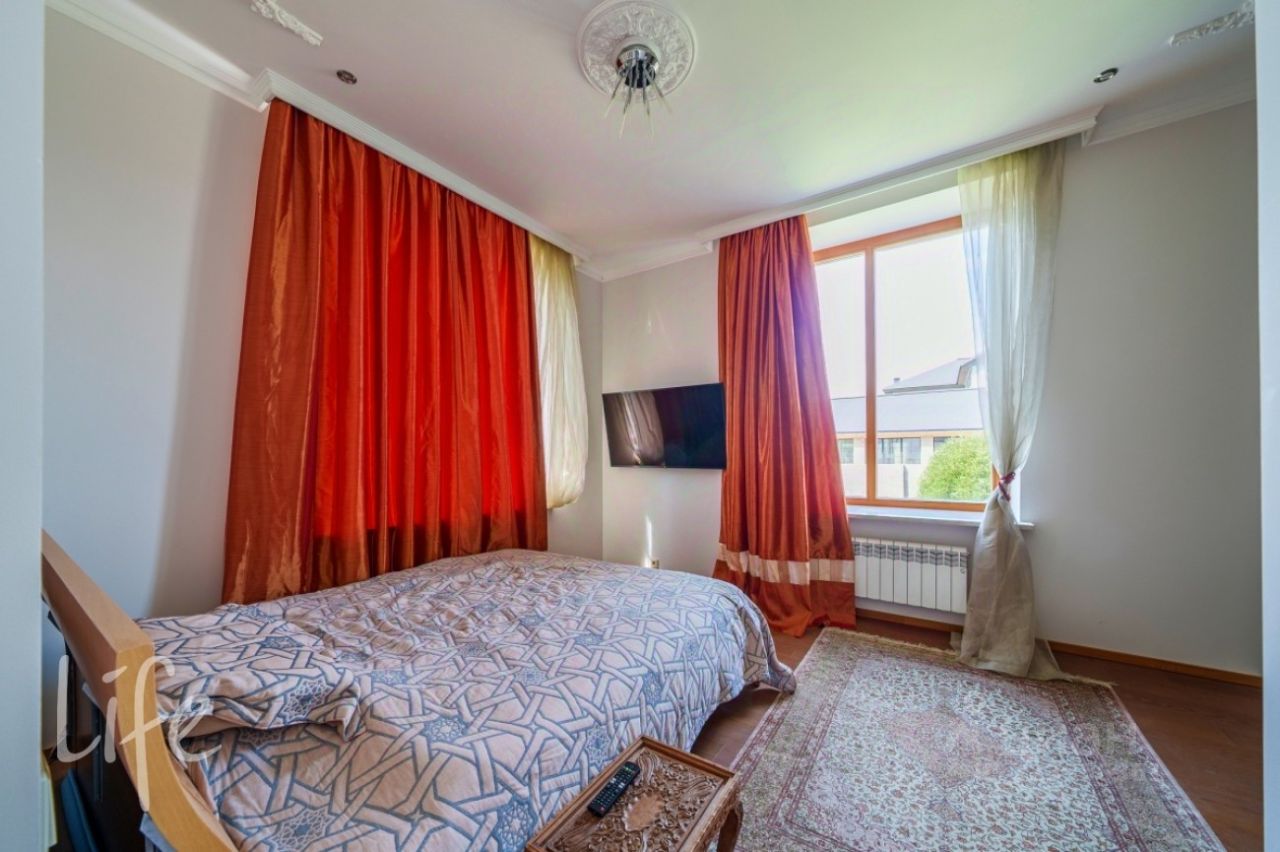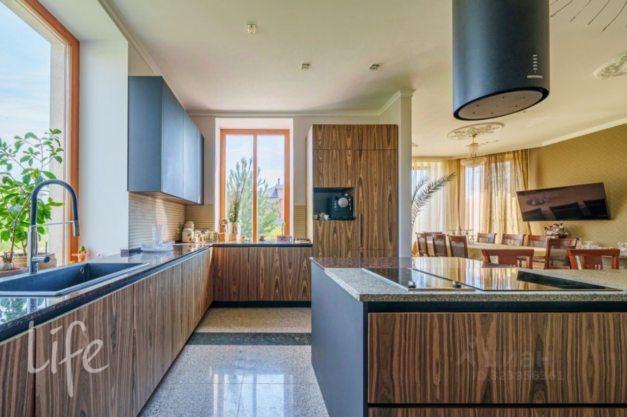 Охраняемый поселок. Уютный жилой дом, полностью под ключ, меблирован и оборудован всей необходимой бытовой техникой. Интерьер выполнен в современном классическом стиле, со вкусом подобрана мебель и аксессуары, предметы быта. Гостиную украшает дровяной камин. Комфортная планировка с пятью спальнями, гостиной подойдет большой семье. Есть квартира для персонала. Все центральные коммуникации. Поселок строго охраняемый.