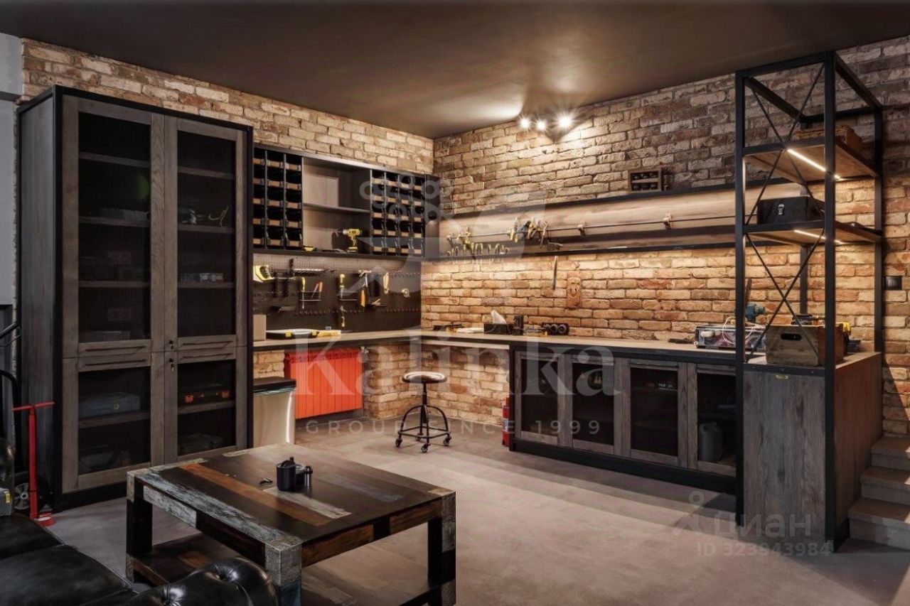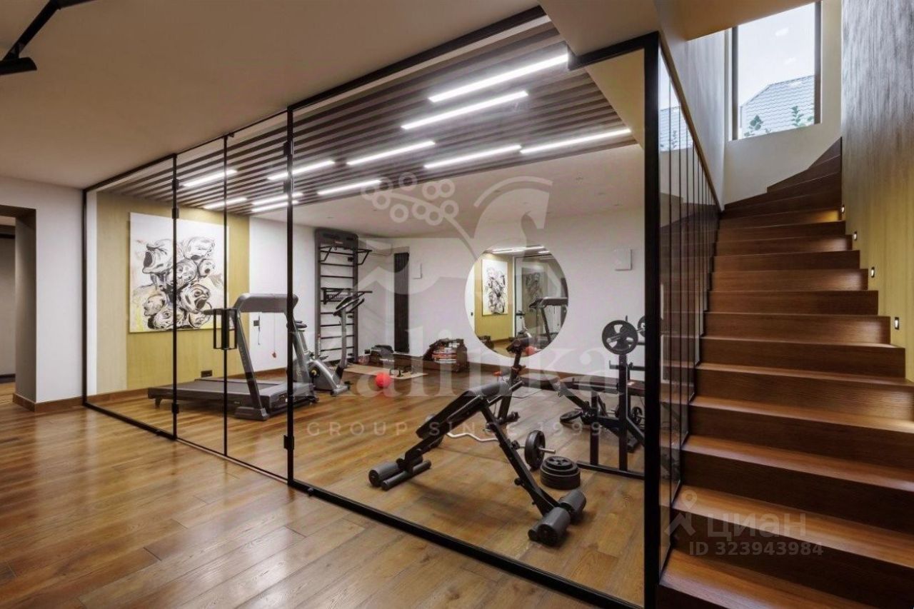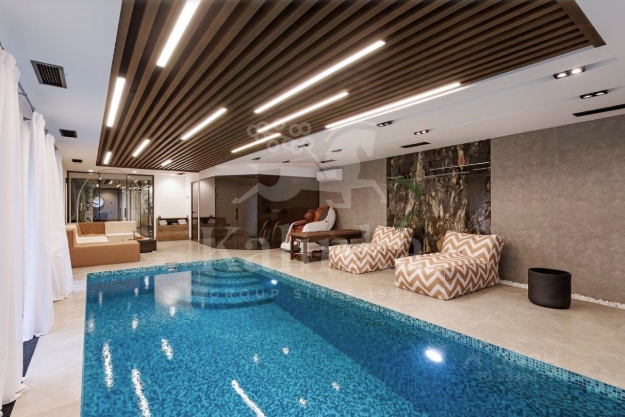 В планировке предусмотрено: 7 спален с санузлами, просторный холл, кухня-столовая, гостиная с камином, стильная застекленная терраса с баром и проектором, гараж с мастерской, тренажерный зал и СПА-зона с бассейном, хаммамом и зоной отдыха.