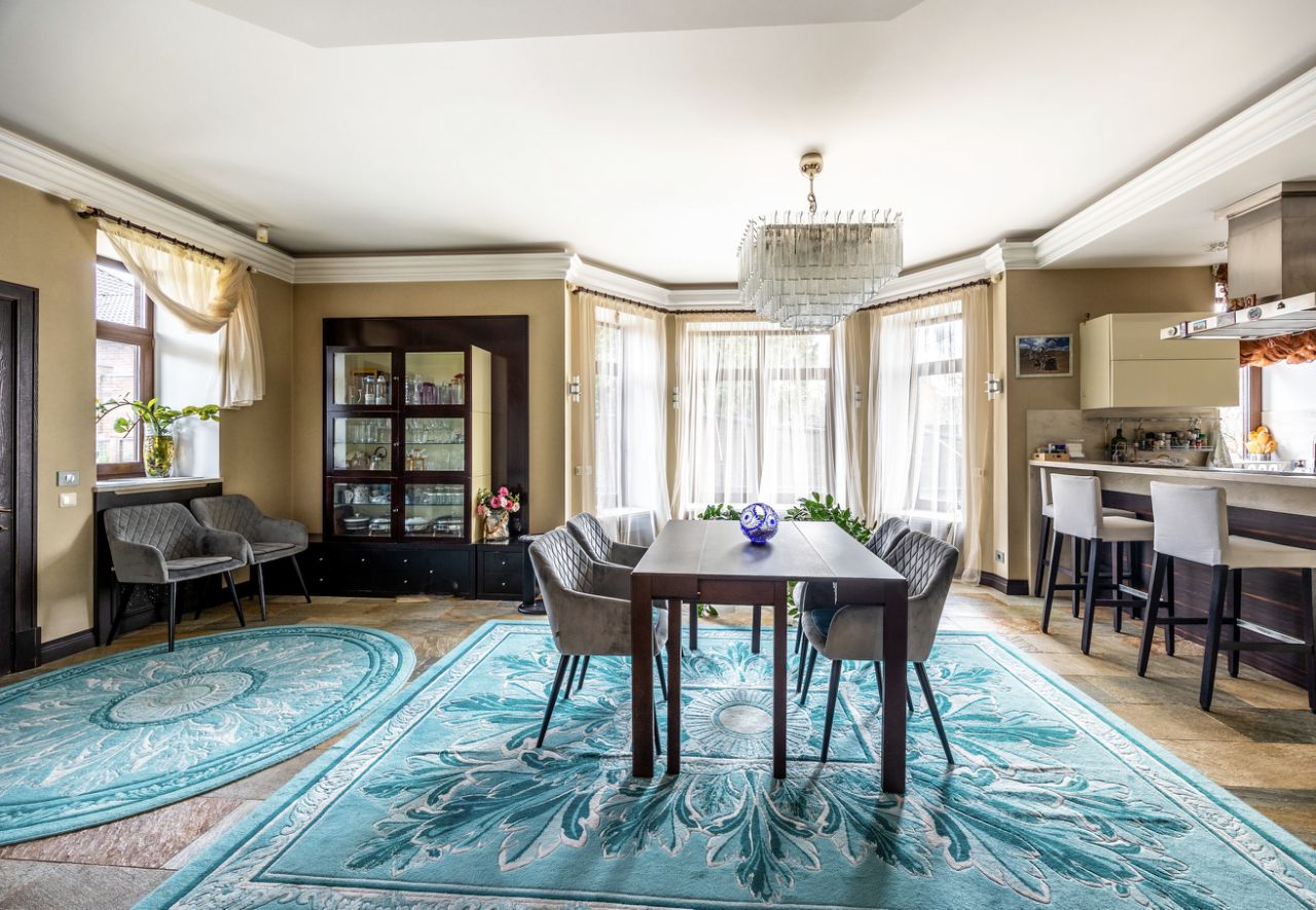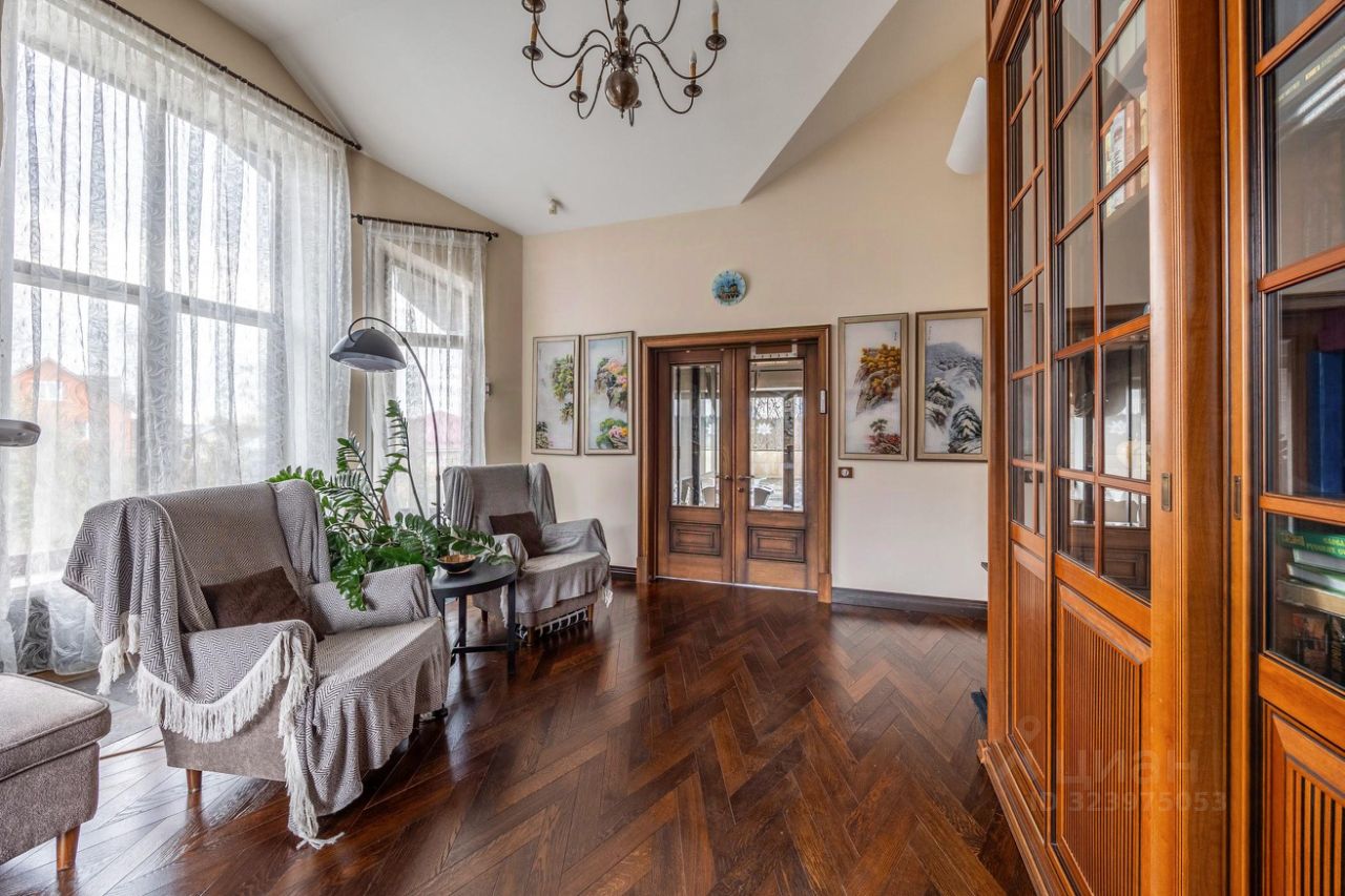 Предлагается на продажу большой кирпичный дом с участком, расположенный на высоком берегу речки Синички, откуда открывается прекрасный вид на лес и воду. Дом 3х этажный 5-ти уровневый. Помещения расположены слева и справа по лестнице на расстоянии в пол-этажа. Планировка и размеры помещений: 1 этаж: гостиная (40), кухня-столовая (50), детская (17), кабинет-мастерская (33) с открытой верандой (27), прихожая, 2 с/у, 2 этаж: спальня (24), кабинет (31) с открытой верандой (50), гостевая (33,5), две гардеробные (14+17), кухонный уголок, 2 с/у, Мансарда: оранжерея (42) Цокольный этаж: кинотеатр (34), кухня (17,9), тренажерная, сауна, хамам, купель, тех.помещение, кладовая, с/у. К дому примыкает теплый гараж на две машины (50).