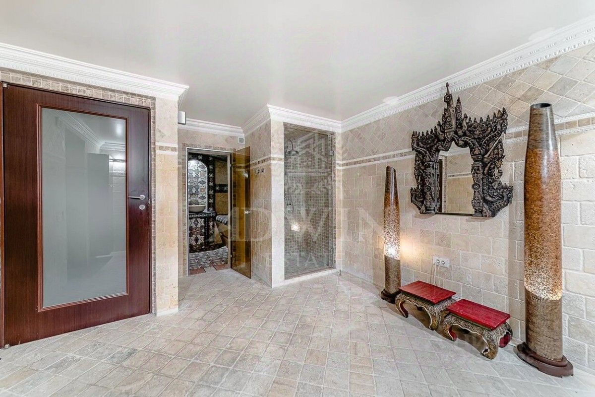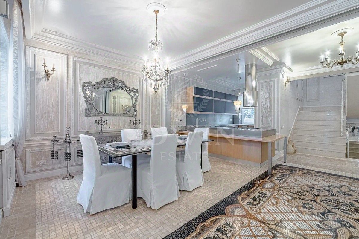 Аренда большого таунхауса площадью 370 кв.м. с эксклюзивным дизайнерским ремонтом в стиле современной итальянской классики. Коттеджный поселок Петровский. В доме просторный первый этаж с гостиной с камином и панорамным видом на лесной участок, есть СПА зона, все спальни с ванными комнатами.