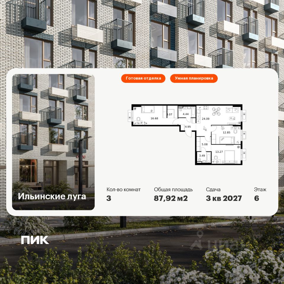 Продаётся 3-комн. квартира площадью 87,92 кв.м на 6 этаже 9 этажного дома (Корпус 4.1, Секция 1) проекта ПИК Ильинские луга. Светлый просторный подъезд на уровне земли, функциональная планировка, большие окна, c отделкой.