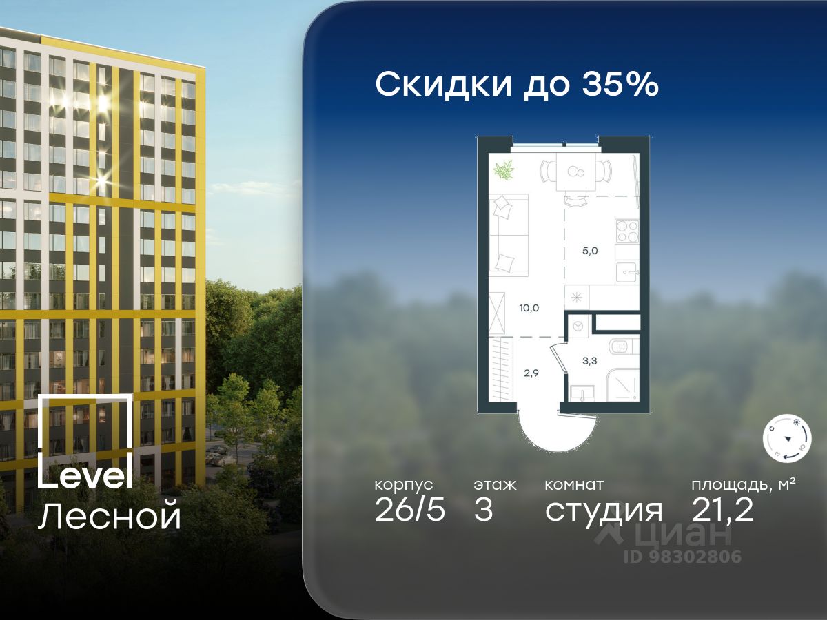 В районе, утопающем в густой зелени лесов, многочисленных парков и скверов, продаётся студия площадью 21.20 кв.м с отделкой white box. Квартира расположена на 3 этаже в жилом комплексе комфорт-класса Level Лесной (компания Level Group/Левел групп).