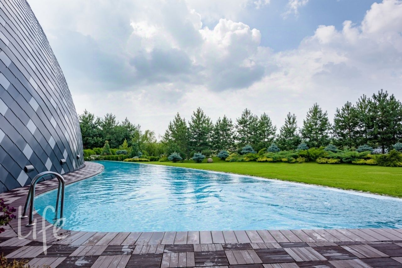Участок с продуманным ландшафтом. Произведено зонирование участка: есть въездная зона и зона парковки, есть закрытая от посторонних глаз лужайка перед бассейном, паркетный сад и сосновый бор, в котором живет семейство куропаток.