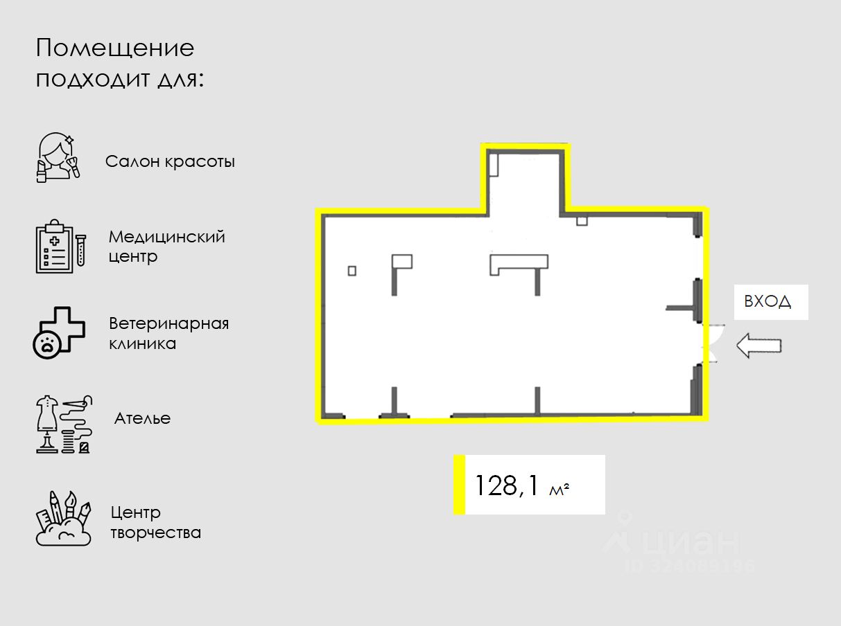 Характеристики помещения: МО, г.о. Красногорск, пос. Ильинское-Усово, Архангельская улица, 15 Помещение угловое, 1 вход, панорамные окна. Напротив находится большая парковка. Рядом с домом школа, остановка общественного транспорта и проходит пешеходный бульвар. Эл. мощность 35 кВт 1 мокрая точка. Помещение хорошо подойдет под открытие салона красоты, медицинского центра, детского центра творчества.
