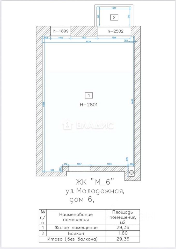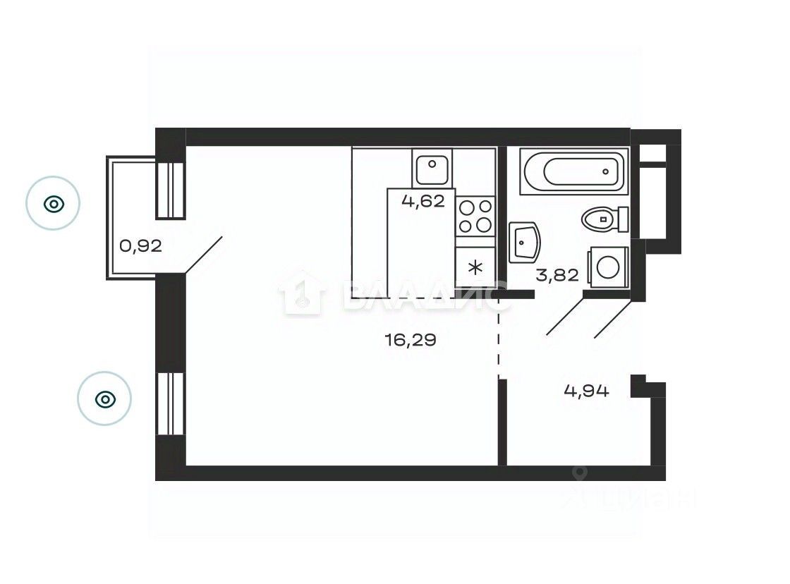 Общая площадь квартиры — 29,7 кв. м, из которых жилая площадь составляет 16,3 кв. м, а площадь кухни — 4,6 кв. м. В квартире есть балкон, окна выходят на улицу. Совмещённый санузел. Квартира угловая, без отделки, что даёт возможность новым владельцам воплотить свои дизайнерские идеи.