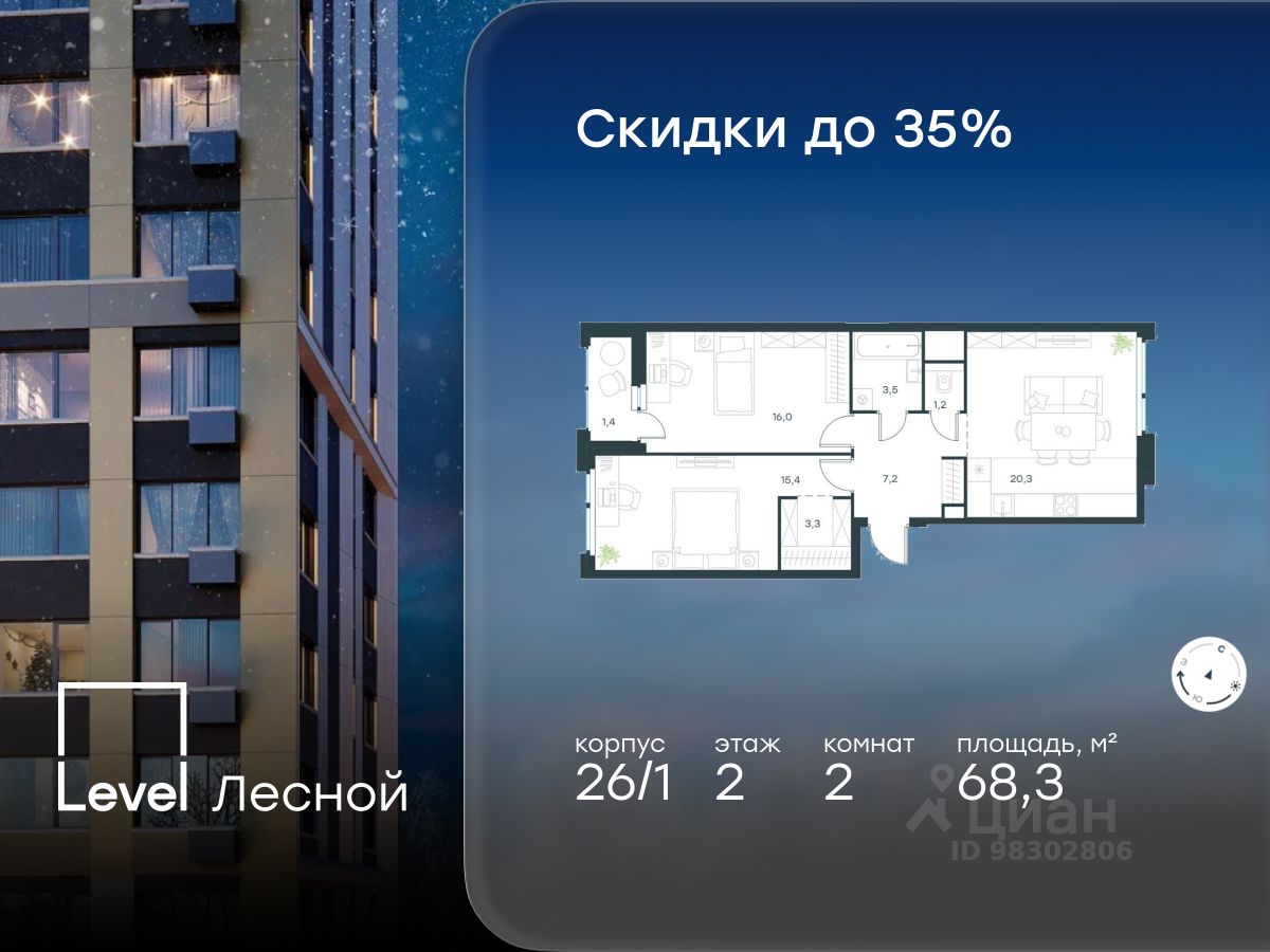 В районе, утопающем в густой зелени лесов, многочисленных парков и скверов, продаётся 2-комнатная квартира площадью 68.30 кв.м с отделкой white box. Квартира расположена на 2 этаже в жилом комплексе комфорт-класса Level Лесной (компания Level Group/Левел групп).