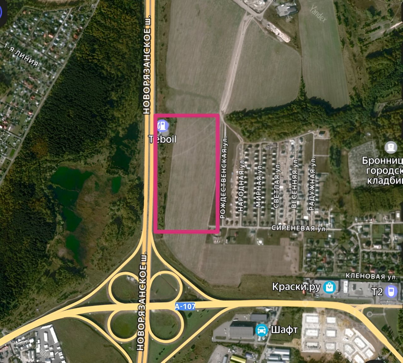 Участок на первой линии Новорязанского шоссе. Площадь - 70 060 м². К/н - 50:62:0020302:671. Удобная траснпортная доступность - пересечение трасс М5 Урал и А-107 Малое бетонное кольцо. Самостоятельный прямой съезд с Новорязанского шоссе (полосы торможения и разгона сделаны). Участок ровный, правильной прямоугольной формы, отсыпан асфальтовой крошкой, огорожен. Входит в территориальную зону О1 - Многофункциональная общественно-деловая. ВРИ - 35 видов. Основные разрешённые виды разрешённого использования (ВРИ) - 22 вида, а именно: Хранение автотранспорта, Деловое управление, Объекты торговли (торговые центры, торгово- развлекательные центры (комплексы), Рынки, Магазины, Общественное питание, Развлекательные мероприятия, Объекты дорожного сервиса, Заправка транспортных средств, Обеспечение дорожного отдыха, Автомобильные мойки, Ремонт автомобилей, Стоянка транспортных средств, Автомобильный транспорт, Размещение гаражей для собственных нужд, Коммунальное обслуживание, Оказание услуг связи, Общежития Бытовое обслуживание, Выставочно-ярмарочная деятельность, Банковская и страховая деятельность, Спорт, Связь.
