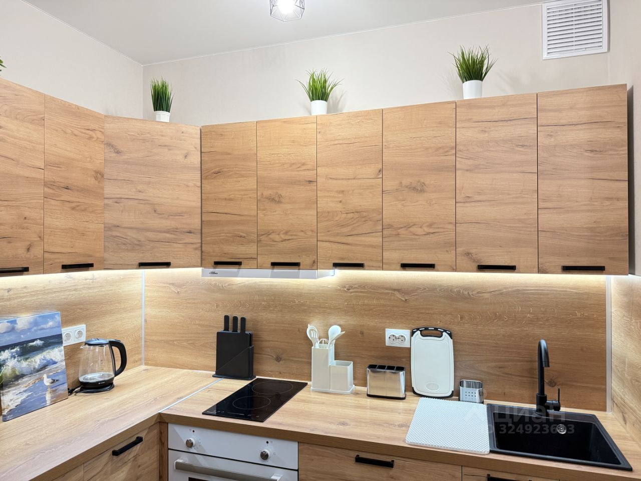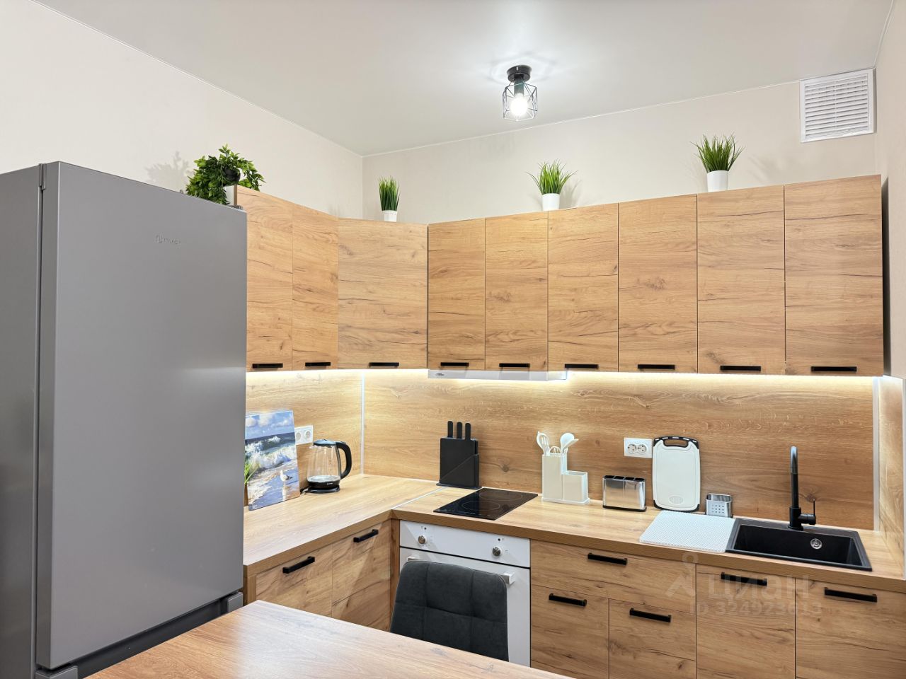 Кухня полностью укомплектована необходимой техникой: плита, вытяжка, духовой шкаф, холодильник, чайник и большое количество шкафов для хранения бытовой утвари.