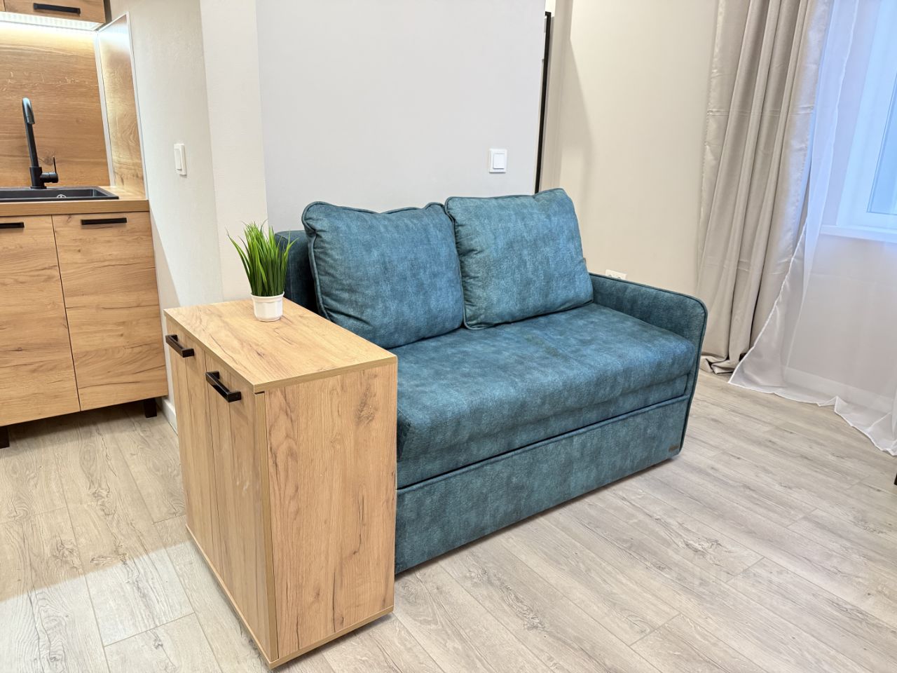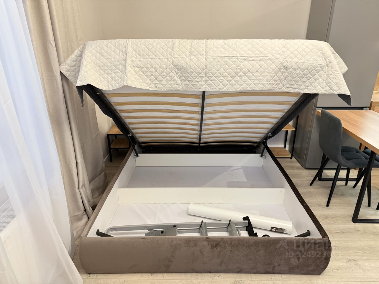 В комнате полноценная кровать с подъемным механизмом, матрас IKEA, дополнительно есть диван, который легко раскладывается в полноценное спальное место.