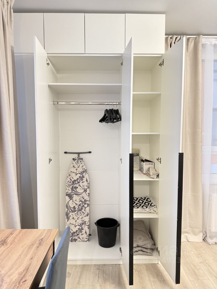 Дополнительно есть функциональная стенка с различными нишами и шкафами для хранения вещей, дополнительно есть отдельно стоящий шкаф для вещей. Рабочий стол, где можно работать за компьютером. Красивый стеклянный столик для еды. Есть гладильная доска и сушилка для вещей.