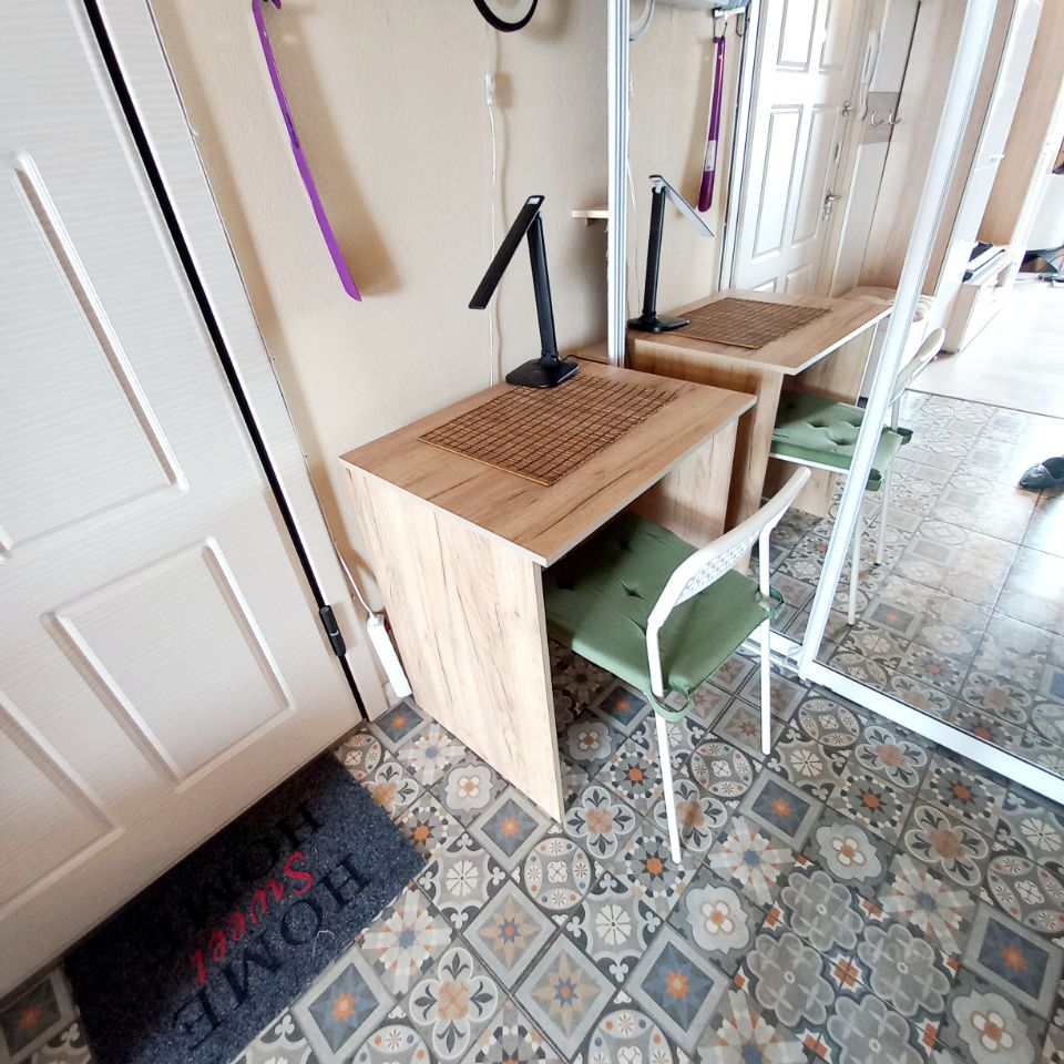 В ПРИХОЖЕЙ: - вместительный зеркальный шкаф-купе для вещей и одежды, с полками, штангами и и.д., - рабочее место (стол, стул), - вешалка, пуфик, обувница.