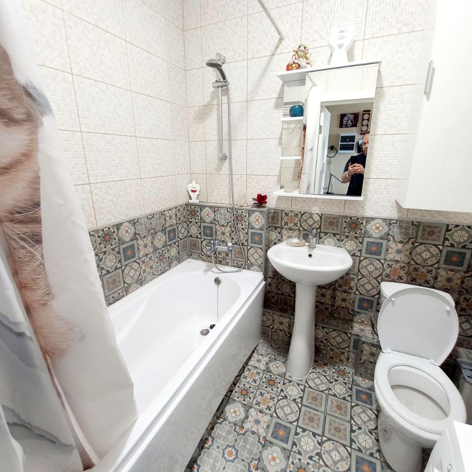 Полностью оборудованный санузел - ванна, унитаз, раковина, полотенцесушитель, два навесных шкафа (один из них с зеркалом), полноразмерная стиральная машина на 6 кг., корзина для белья, на полу уютный теплый коврик.