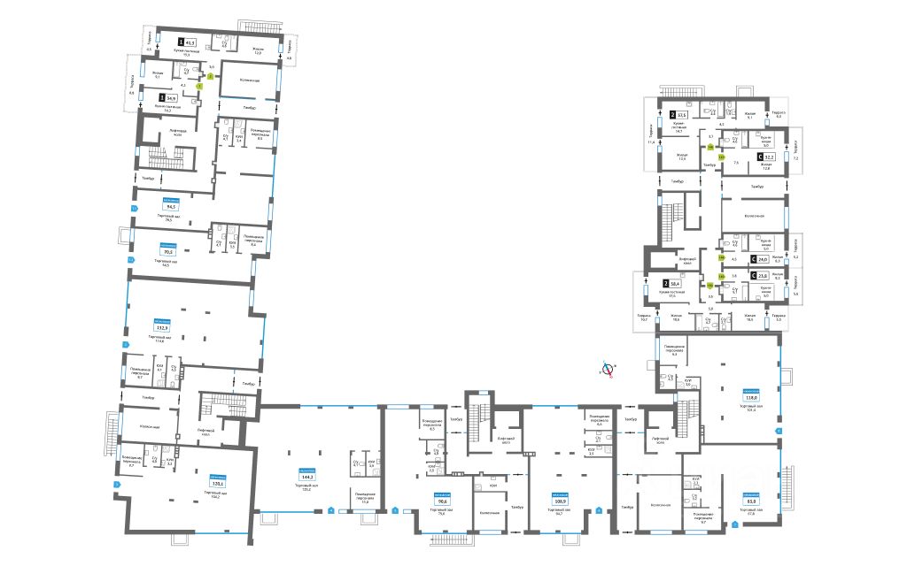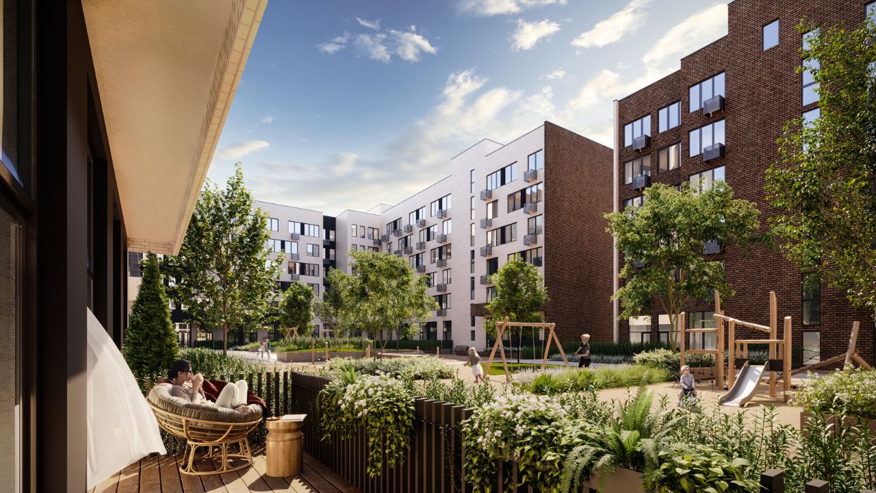 Проектом предусмотрены 14 корпусов средней этажности 6-9 этажей, а также муниципальная школа, один муниципальный и один частный детский сад, два наземных многоуровневых паркинга с кладовыми помещениями.