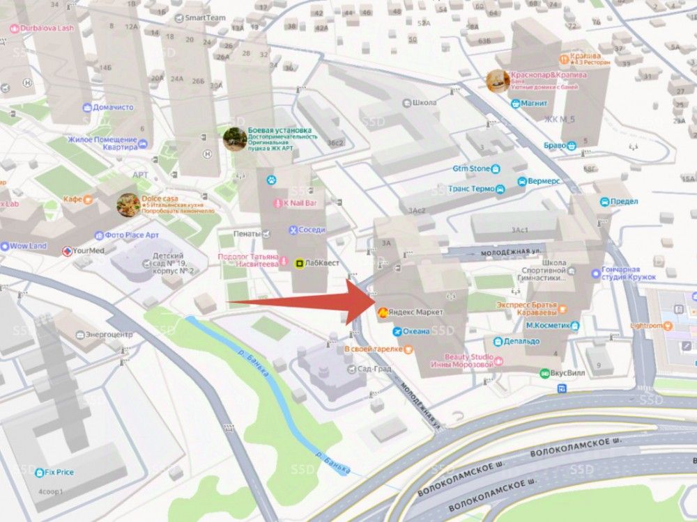 Торговое окружение: Магнит, ВкусВилл, Буханка, Ароматный мир, барбершоп Лондон, магазин цветов Flower shop, кофейня Prana и др.